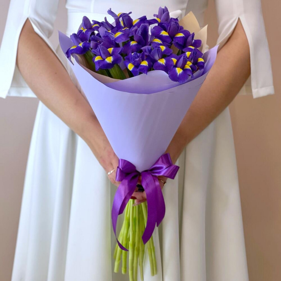 На фото букет из 19 фиолетовых ирисов. В составе: ирис 19 шт, дизайнерская упаковка 1 шт, атласная лента 1 шт, . Все цветы свежие и ароматные, букет красиво оформлен и отлично подходит для подарка. Доступна доставка цветов или самовывоз.