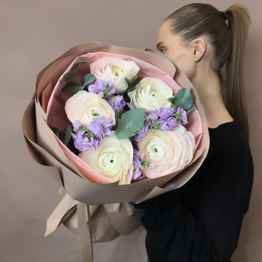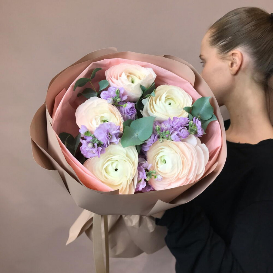 Букет из розовых ранункулюсов и сиреневой матиолы в Гае